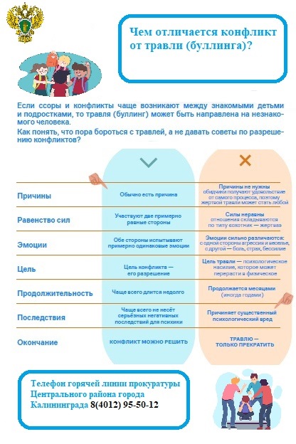 Отметим, что в нашей стране в образовательных организациях периодически происходят ситуации, связанные с тем, что обучающиеся конфликтуют, проявляют агрессию друг на друга. В отличие от эпизодических инцидентов, травля (буллинг) – это, продолжающийся по времени конфликт, при котором существуют устойчивые роли преследователя и жертвы. Дополним, что помимо преследователей и жертвы проявлениям буллинга в образовательной организации присуще наличие большой группы несовершеннолетних - свидетелей происходящего, которые могут присоединиться (активно или неактивно, через поступки) к тем, кто преследует, или к тем, кого преследуют.